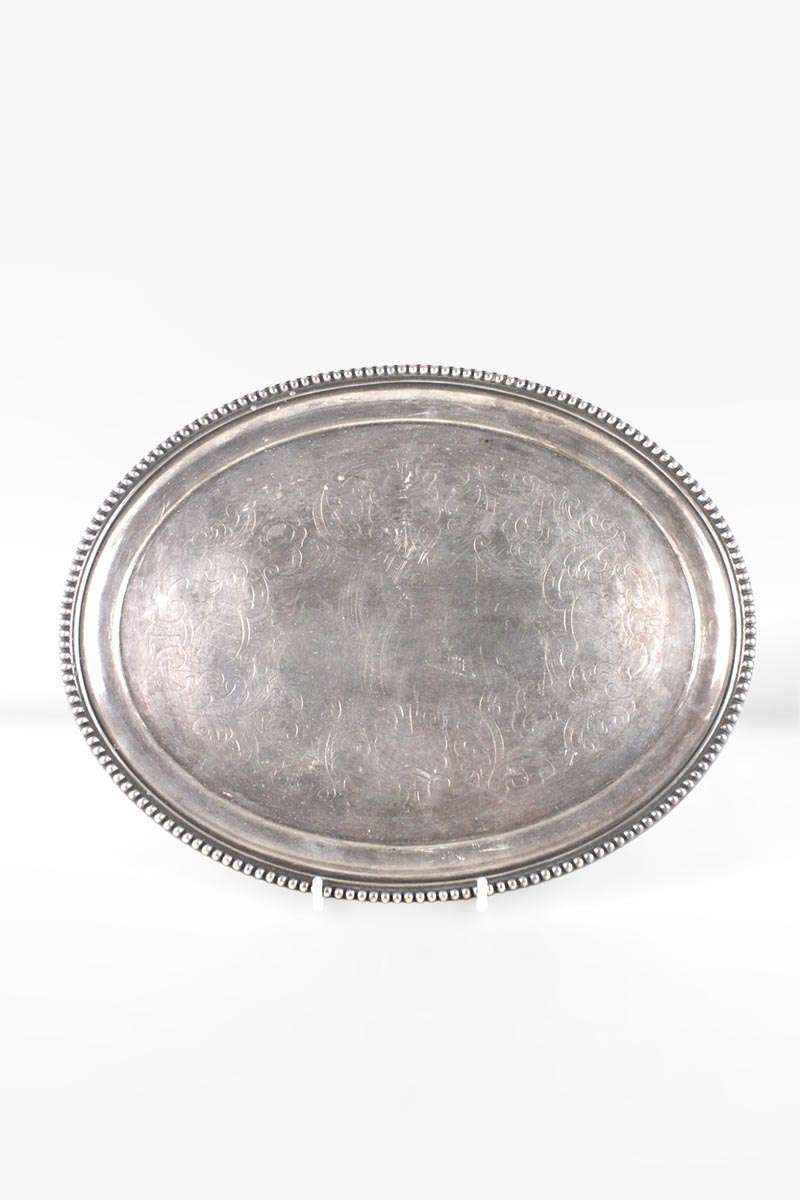 Silver Plated Oval Tray with Engraved Pattern and Beaded Edge – No Handles
