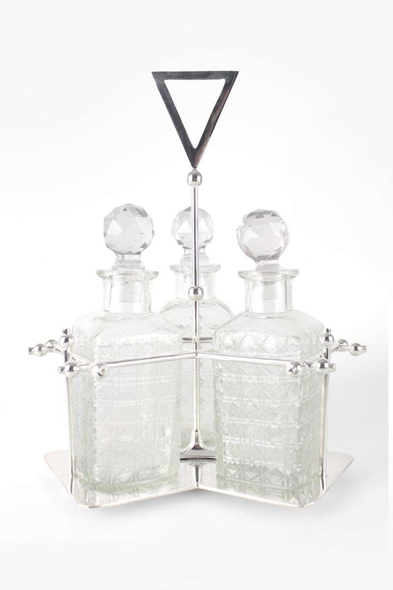 Silver Plated Tri-form Art Deco Style Tantalus with 3 Hobnail Cut Decanters