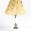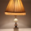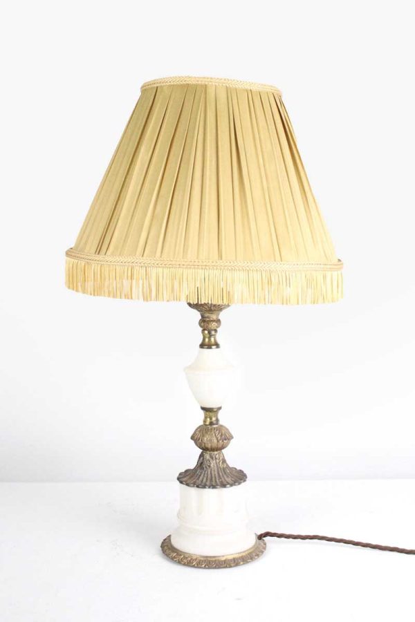 Small White Brass and White Ceramic Table Lamp with Gold Pleated Shade and Fringe
