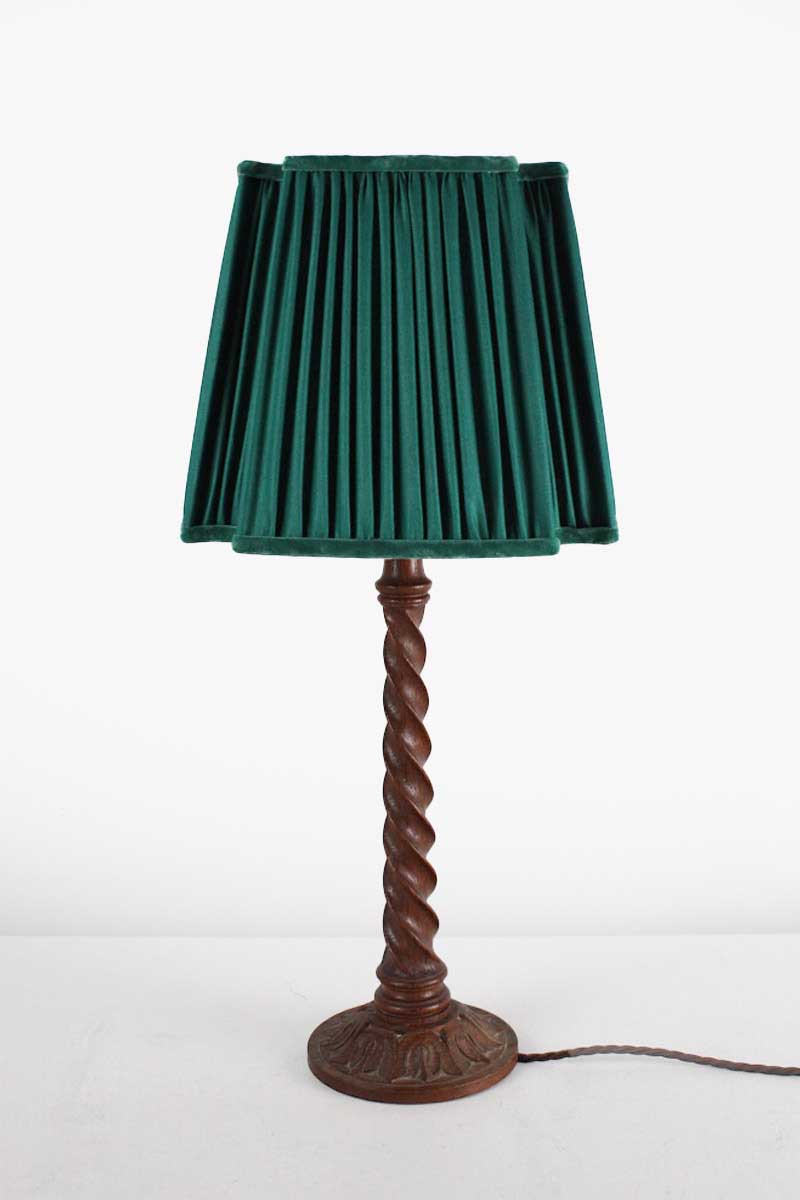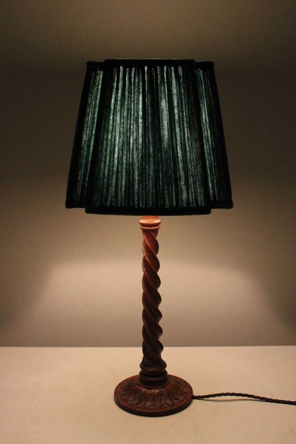 Small Wooden Barley Twist Table Lamp with Floral Carving and Green Fluted Square Pleat Shade