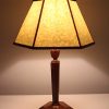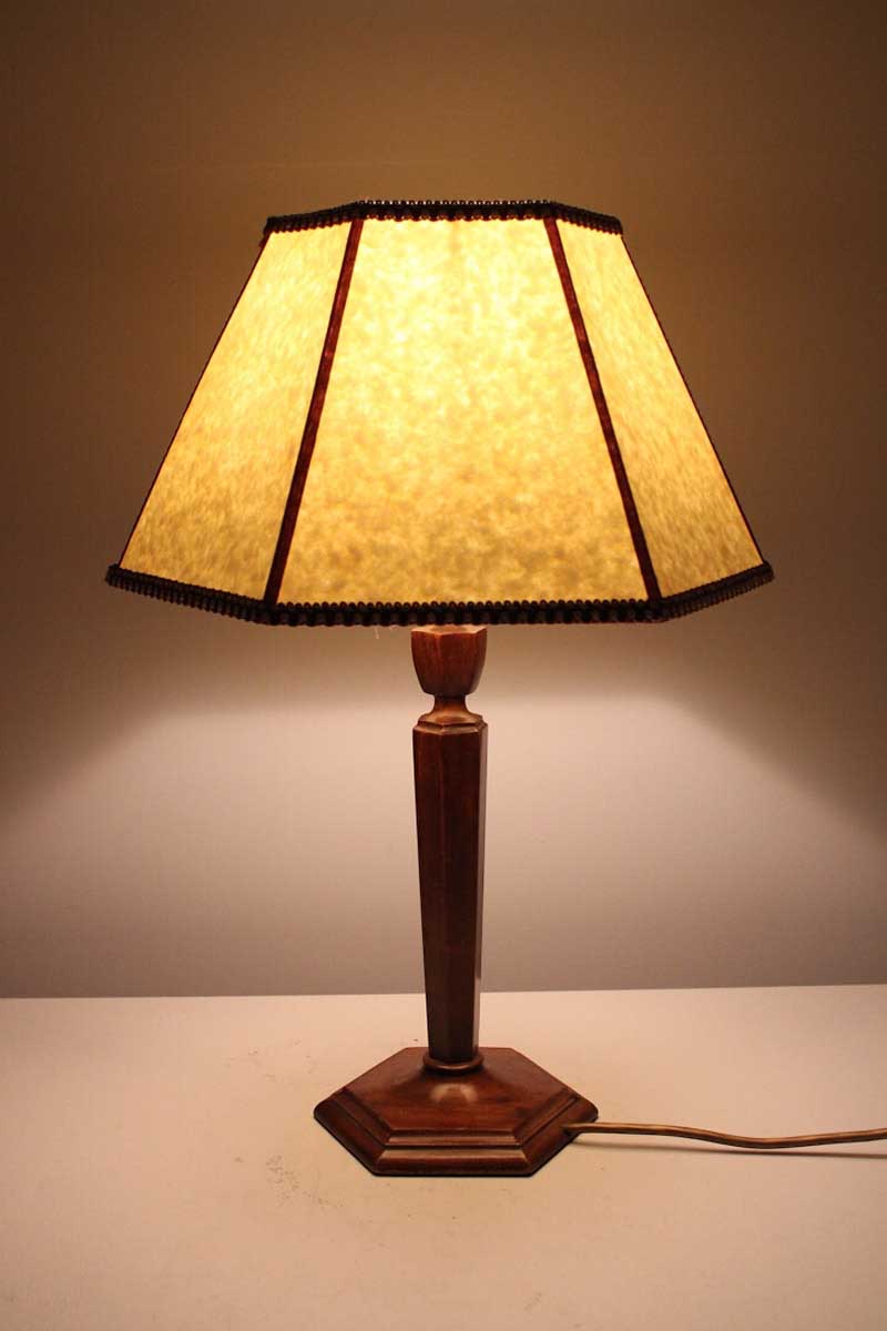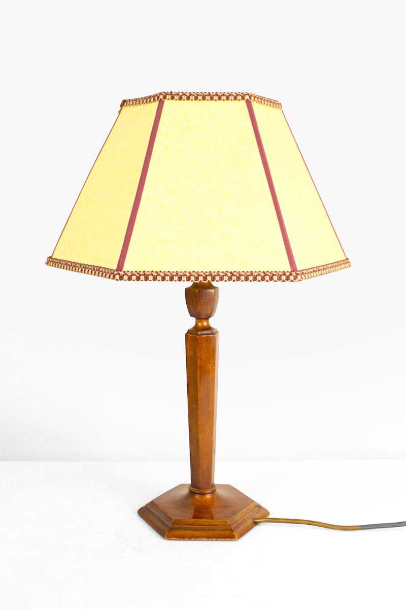 Small Wooden Hexagonal Table Lamp with Hexagonal Cream Card Shade and Burgundy Trim
