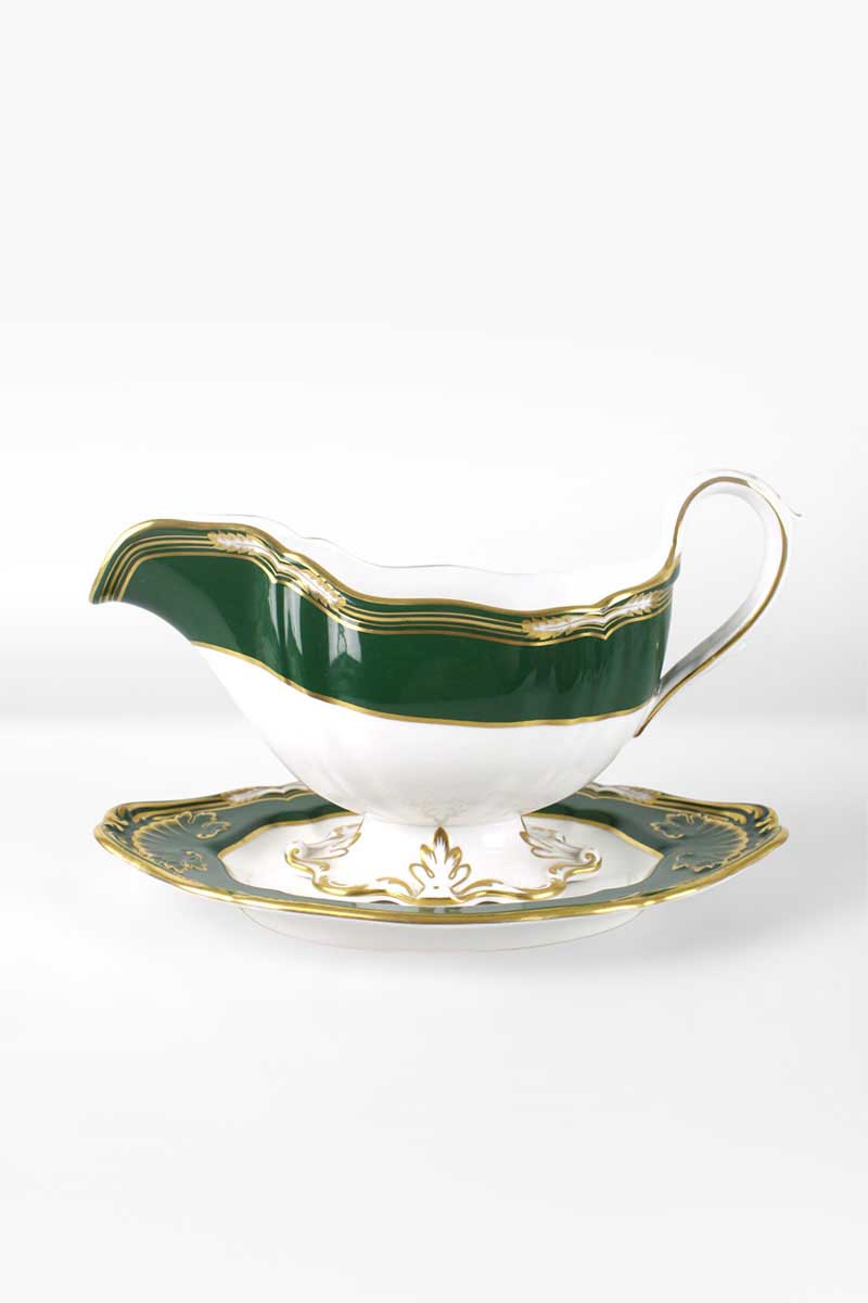 Spode Harrogate Gravy Boat & Saucer with Wide Dark Green Border & Gold Rim