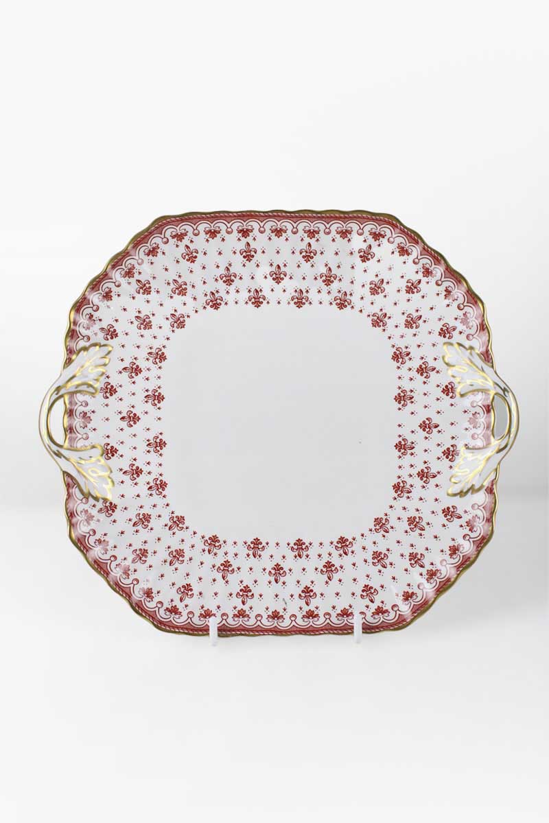 Spode Red Fleur De Lys Octagonal Bread / Cake Plate with Ribbed Border Gilt Rim & 2 Handles