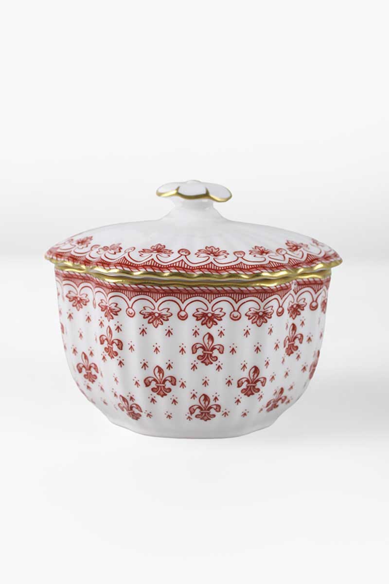 Spode Red Fleur De Lys Shaped Oval Sugar Pot & Lid with Ribbed Sides & Lid & Gilt Rim