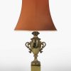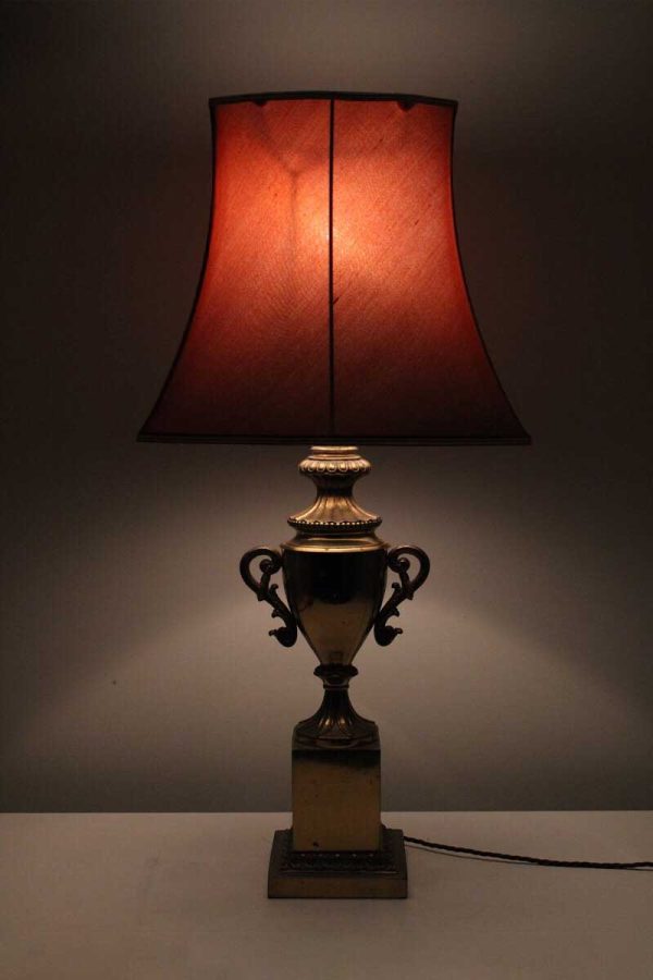 Tall Gilt Brass Urn Shaped Ornate Table Lamp with Terracotta Rectangular Bowed Shade and Gold Trim