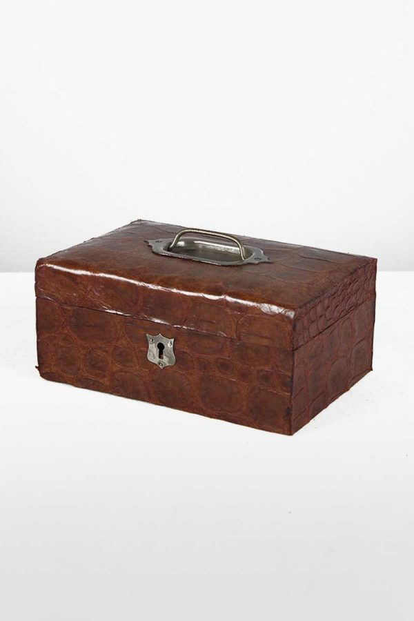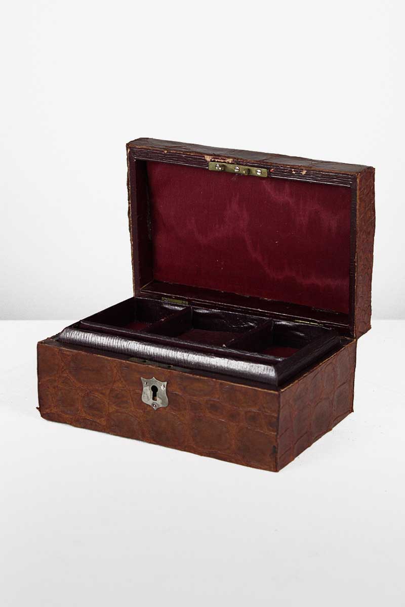 Victorian Tan Crocodile Jewellery Box with Red Silk and Velvet Fitted Interior