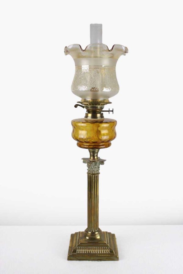 Victorian Brass Corinthian Column Oil Lamp with Amber Glass Font and Amber Tinted Tulip Shade