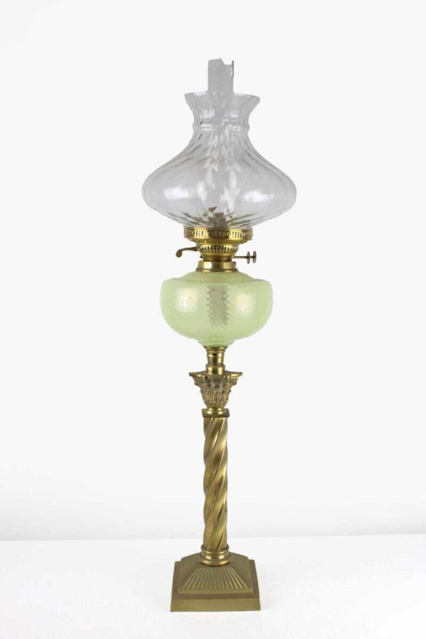 Victorian Twisted Brass Column Oil Lamp with Yellow Vaseline Glass Font and Etched Tulip Shade