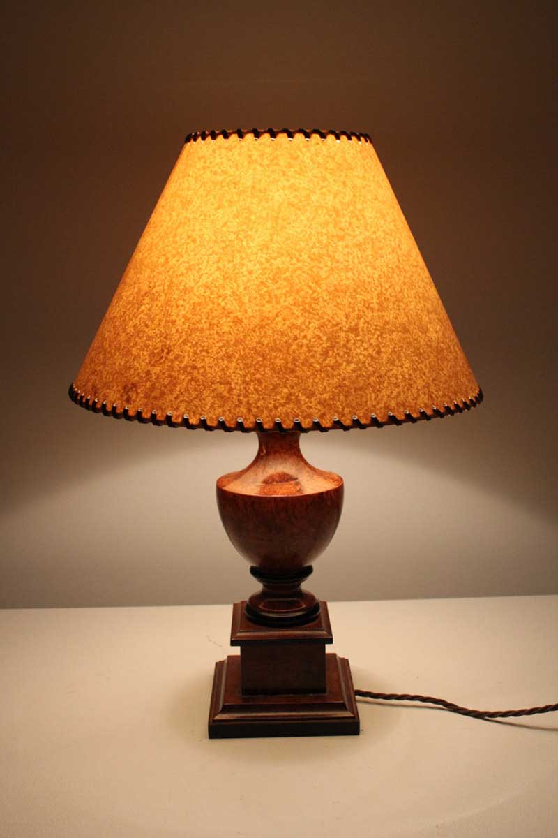 Walnut Urn Table Lamp with Ebonized Detail and Parchment Lamps with Leather Thonging