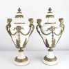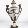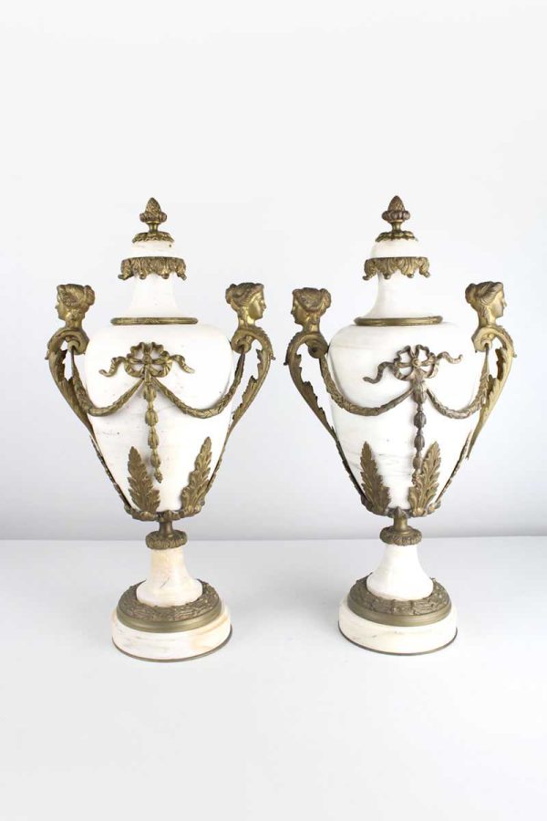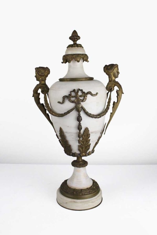 White Marble Lidded Urn with Ornate Bronze Metal Swags and Handles with Female Heads