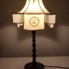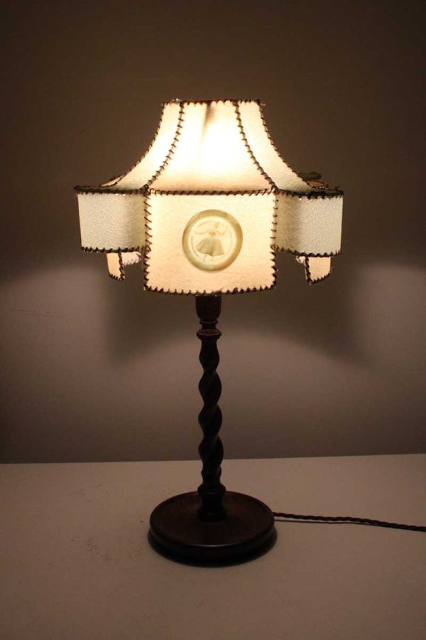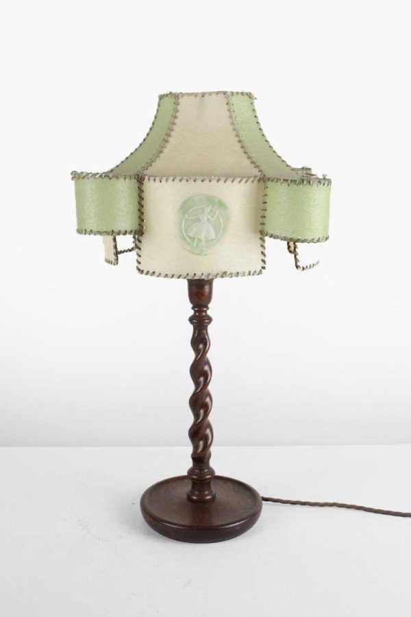 Wooden Barley Twist Table Lamp with 1930s Green and Cream Shaped Parchment Shade