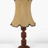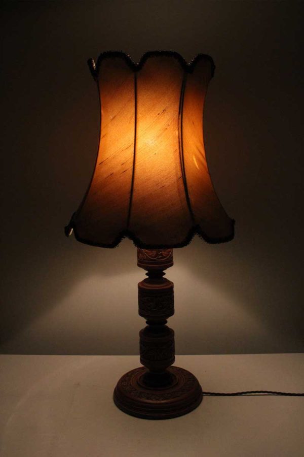 Wooden Column Table Lamp with Flora Carving and Bowed Beige Shade with Metallic Trim