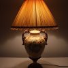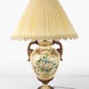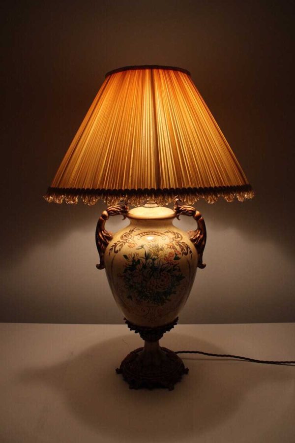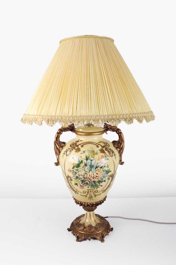 Yellow and Gold Floral Urn Form Table Lamp with Bronzed Base and Handles with Yellow Pleated Shade